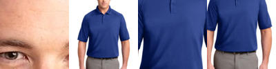 5 oz./yd2 / 172 gsm, 100% polyester face plaited to 60% polyester, 40% cotton back (total overall garment 61% polyester, 39% cotton); Proprietary dual-sided mesh pique knit constructed of fine denier wicking polyester on the outside and soft-as-cotton wicking blend on the inside; Moisture-wicking performance with UV 15-39 protection; Matching flat-knit collar; Luxury, comfort and performance in one; Three-button placket; Dyed-to-match buttons;