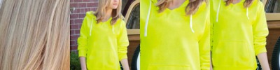 - Raw edge seams around hood opening, pocket seams and neckline