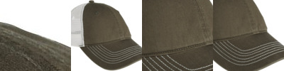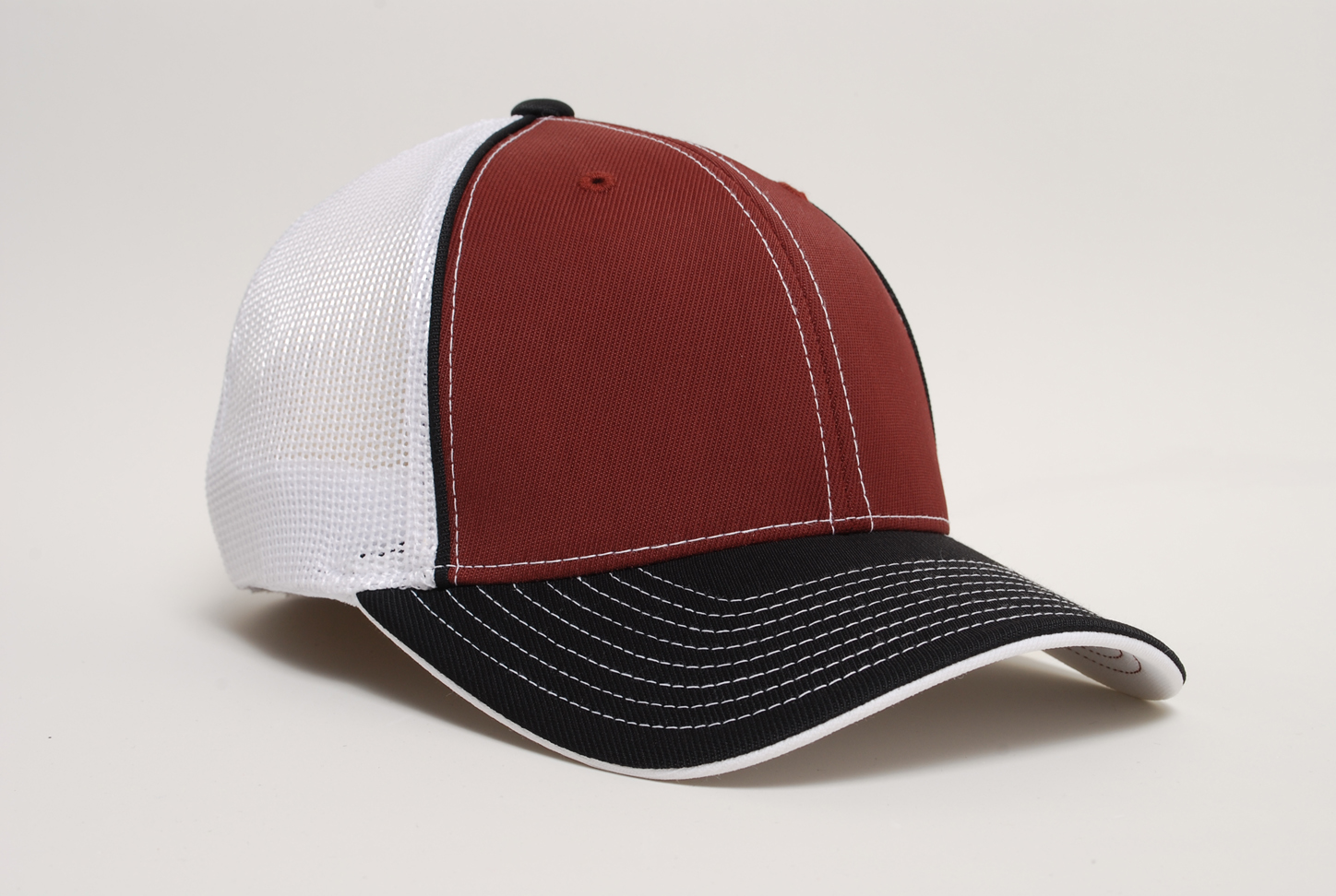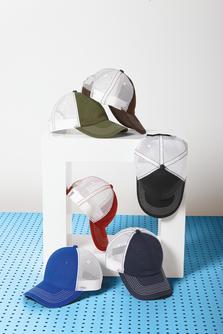 Crown: 2-tone poly twill panels with contrasting stitching, white spandex trucker mesh back 4 panels