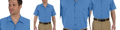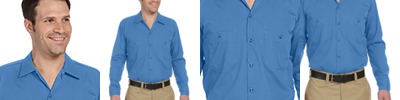 65% polyester/35% cotton • 5-oz. • wrinkle-resistant • stain-release fabric • moisture-wicking • tailored fit • dyed-to-match buttons • collar stays • front welt pocket • industrial laundry friendly • Sizes: S-2XL