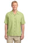 From afar this laid-back camp shirt looks like a solid, but look again. A playful (and subtle) leaf pattern adds tonal design. Easy care convenience and a soil-release finish makes it ideal for work or play.
