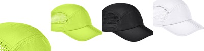 100% polyester; Triangle perforated side panels; Runner style; Unique panel design; Full self-fabric binding; Foldable bill; Adjustable hook and loop closure with reflective stripe and rubber tab;