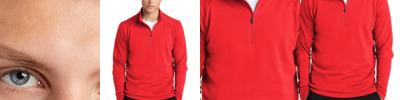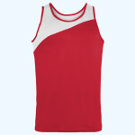 100% polyester wicking knit ; Wicks moisture away from the body; Pad print label ; Self-fabric binding at neck and armholes; Asymmetrical contrast color yoke; Double-needle hemmed bottom;