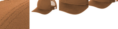 100% cotton front panel and visor; 100% nylon mesh back panel; 6-panel, unstructured, low-profile, pre-curved visor; Pigment-dyed front panels with contrast stitiching (matches back panels); Traditional tan nylon mesh back panels; Self fabric strap with adjustable antique brass slider back closure; Four-row stitching on visor;