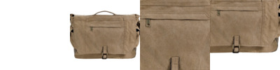 12 oz., 100% cotton concrete canvas; Large interior pocket equipped with functional pocketing; Padded laptop sleeve; Zippered outer pocket and two secure side pockets; Snap closure; 15.6L capacity; 16"W x 12"H x 5.25"D;