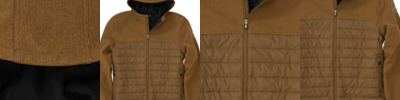 90% polyester, 10% spandex ; Bonded softshell upper body and sleeves; 100% polyester channel puffer with 3 oz. polyfil; Water-resistant DWR finish; Zippered hand pockets ; Three-piece hood with scuba collar and inside drawcords; Adjustable cuffs; Classic fit;