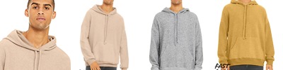 7.5 oz., 55% cotton, 39% polyester, 6% rayon triblend fleece; off white drawcords; 1x1 rib armhole openings and waistband; set-on pouch pocket;