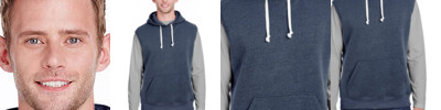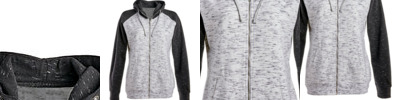 7.3 oz., 60% cotton, 40% polyester mélange fleece; Contrast self-fabric sleeves and hood; 1x1 rib cuffs and waist; Full front zippered placket;