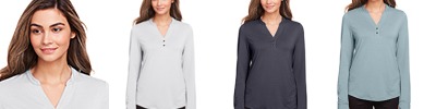 The Henley placket with a metal two-snap closure adds a stylish touch, while self-fabric cuffs with integrated thumbholes provide added functionality and warmth. A hi-low hemline and side vents ensure a comfortable, active fit, making this jersey ideal for both everyday wear and active lifestyles. Easy care and stretch performance complete this versatile, environmentally-friendly piece.