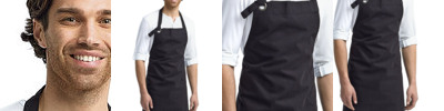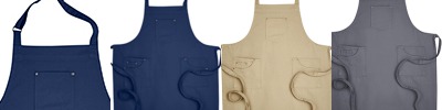 8 oz., 70% cotton, 30% polyester twill; 14" wide centre pocket with reverse contrast trim; combined pen pocket; metal eyelets secure 39" contrast fabric ties; neckband with gun metal buckle fastening for height adjustment; reverse contrast denim top centre pocket; 34" L x 28" W; Oeko-Tex® Standard 100 certified; WRAP certified;