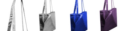 90 gram heavyweight polypropylene with metallic coating; recyclable; self fabric handles measuring 24” with a drop handle length of 11”; 14” L x 15” H;