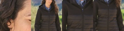 - Three-piece jersey lined, contrast-color hood with sewn eyelets and contrast-color drawcord