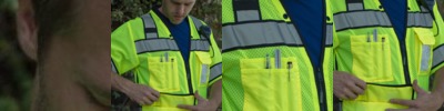 - Left chest radio pocket with clear ID pocket and flap