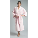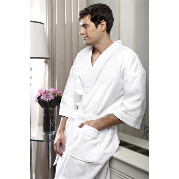 This bathrobe made of 100% combed cotton terry velour with 48" length. An ageless fabric constructed with fine shears to create a velvet touch outside while maintaining absorbent loops on the inside. Bathrobe details include adjustable belt loops for flexible belt height, patch front hip pockets and hanger loop for convenient storage. 330 GSM. 11 oz.