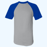 4.8 ounce 50% polyester/50% cotton jersey knit * Crew neck * Contrast color neck and sleeves * Raglan sleeves * Serged fishtail bottom