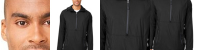 1 oz./yd² (US), 1.7 oz./L yd (CA), 100% recycled nylon Water-repellent Three-piece hood with brim detail Shock cord at hood and hem Self-fabric chin guard Contrast center front reverse coil zipper with auto lock slider and toggle Lower zippered pockets with zipper garages Packable style into self-pocket bag Partial encased elastic cuffs