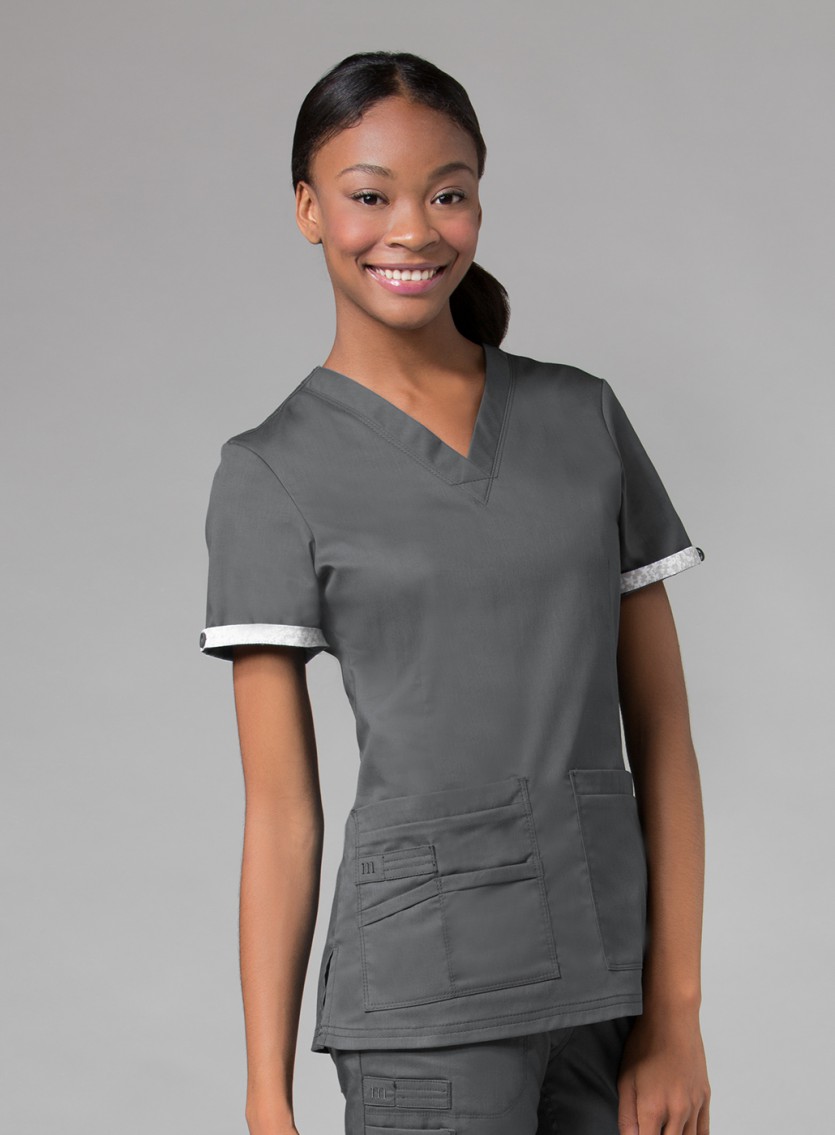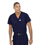 If this top had more storage, we'd have to call it a garage! This five pocket top is an easy-to-wear V-neck pullover with one breast pocket, two lower layered pockets on the left and a single pocket with an interior cell phone division on the right. Locker loops make this top easy to hang up after a long shift. 65% Polyester/ 35% Combed Cotton Medium regular length 30"