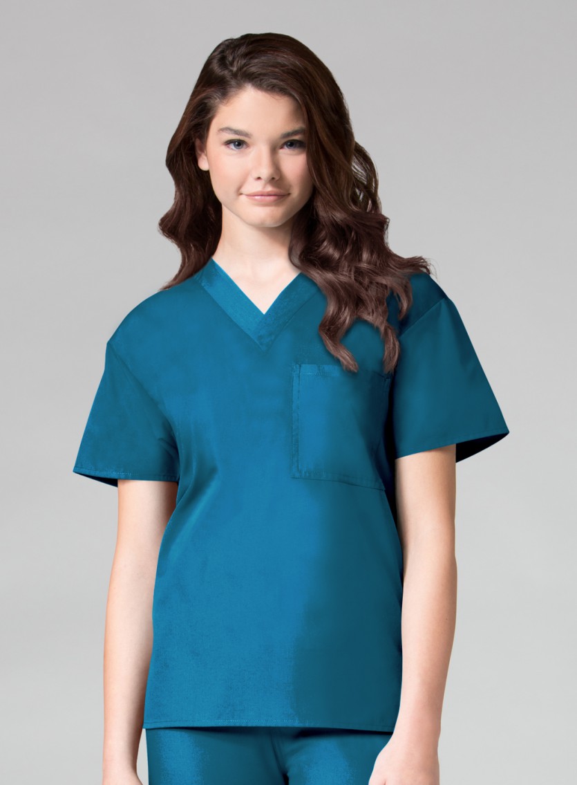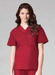 A missy fit, v-neck top features Dickies logo twill tape at the back neck, patch pockets, a stretchy knit interior pocket, and side vents. Center back length: 27".